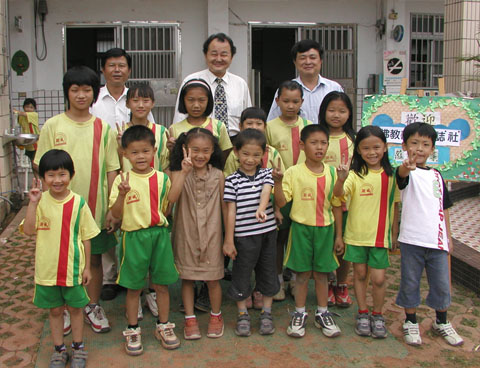 本社 張社長至南投魚池新城國小捐助營養午餐費與家長會黃會長島慶(左後)陳校長傳盛(右後)及受關懷小朋友合